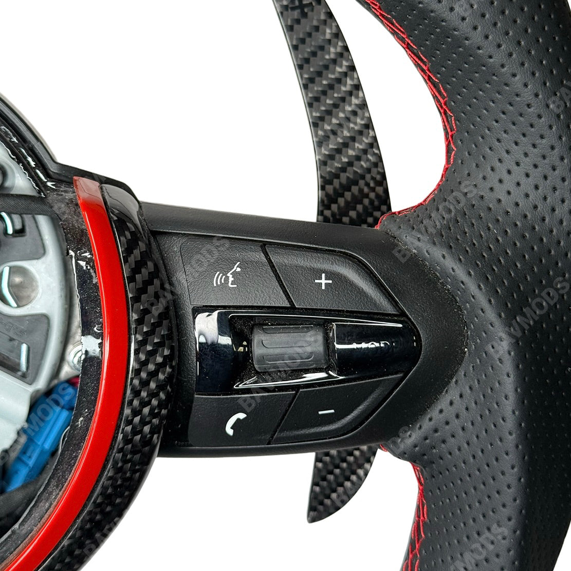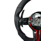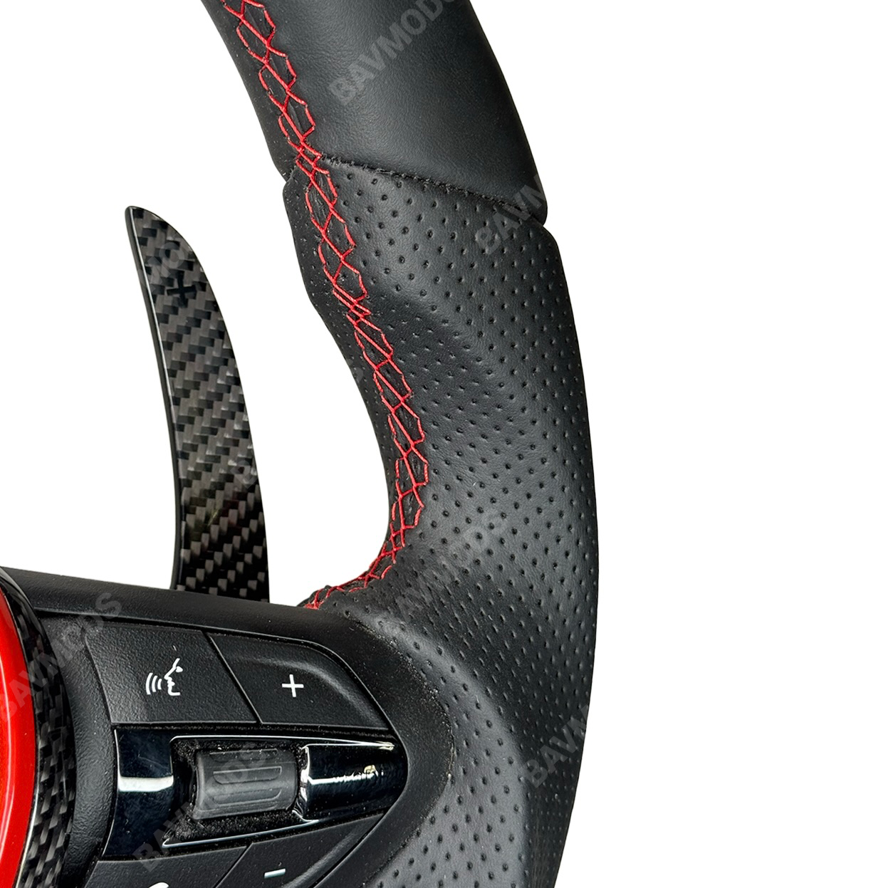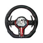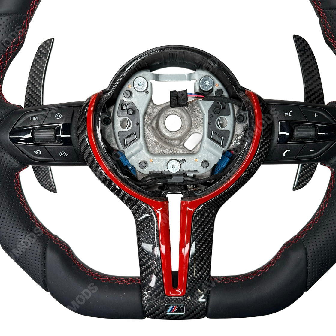 Custom 1 / 2 / 3 / 4 Series Flat-Bottom Carbon Fiber M-Sport Steering Wheel Preset 014 | Carbon Paddles, Red Stitching, Twill Carbon | F Chassis - F1X F2X F3X F4X and more